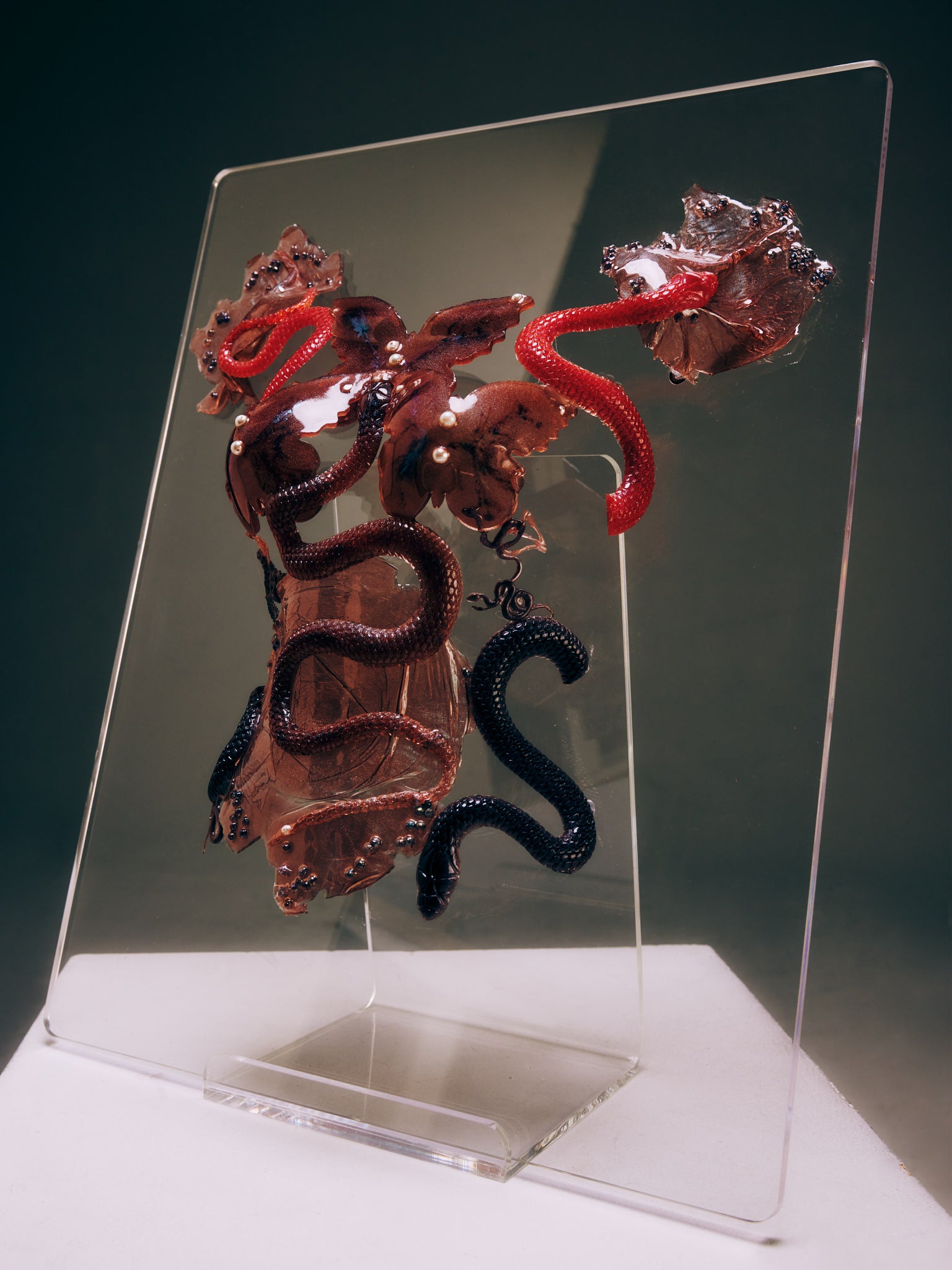 This sculptural work presents a captivating interpretation of the female torso, combining organic forms with mythological symbolism. Crafted from resin, ink, and plexiglass, the piece features a polished surface interwoven with natural textures and subtle color shifts. Vivid red and black serpents coil and weave around the torso, their sinuous shapes creating a sense of movement that brings the sculpture to life within a clear rectangular frame. This transparent enclosure not only protects the work but also enhances the delicate interplay of light, color, and three-dimensional form.