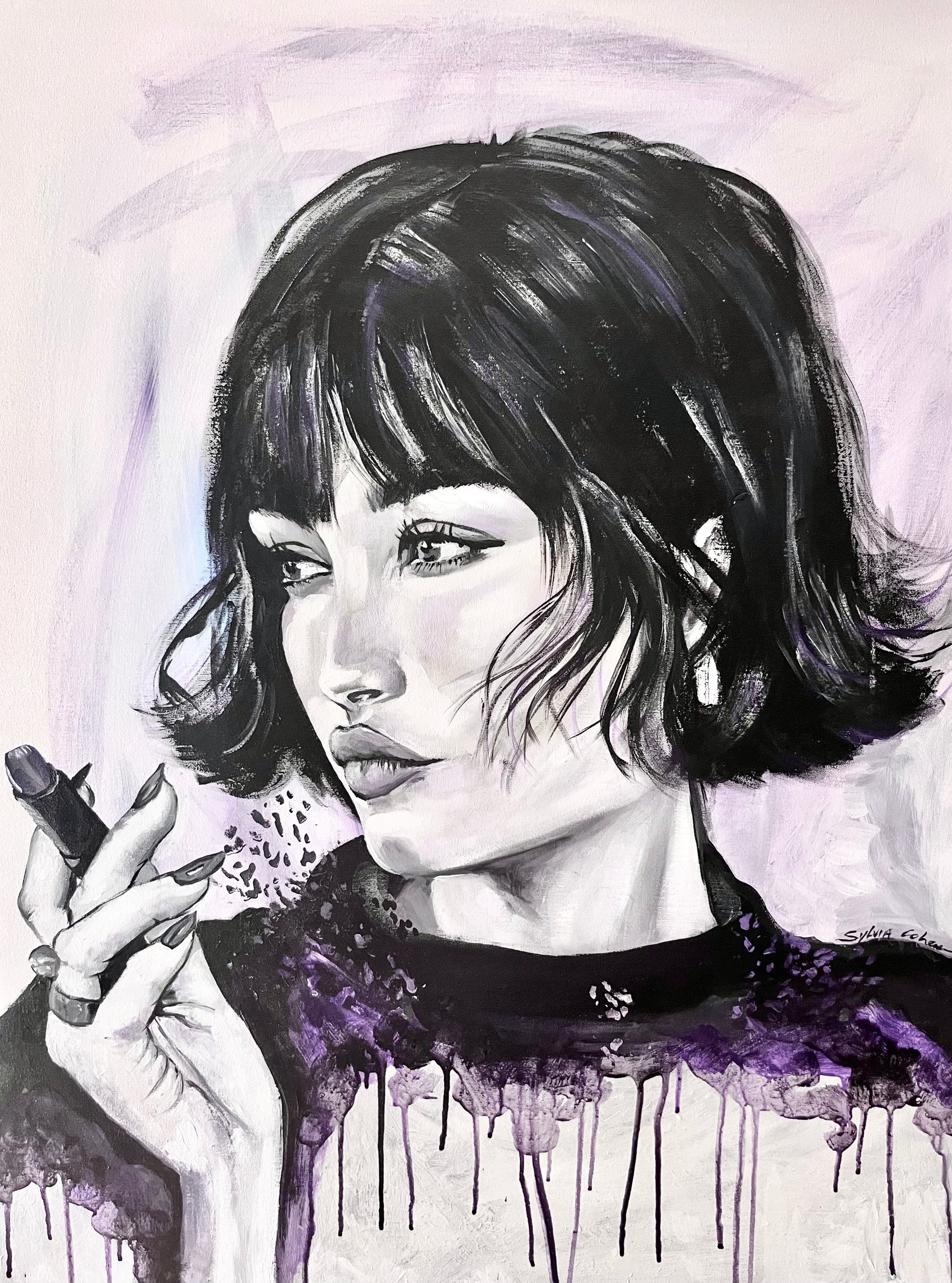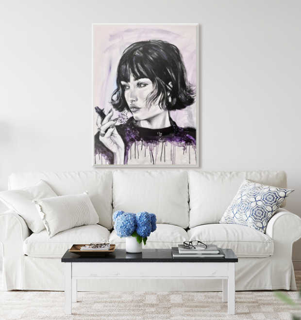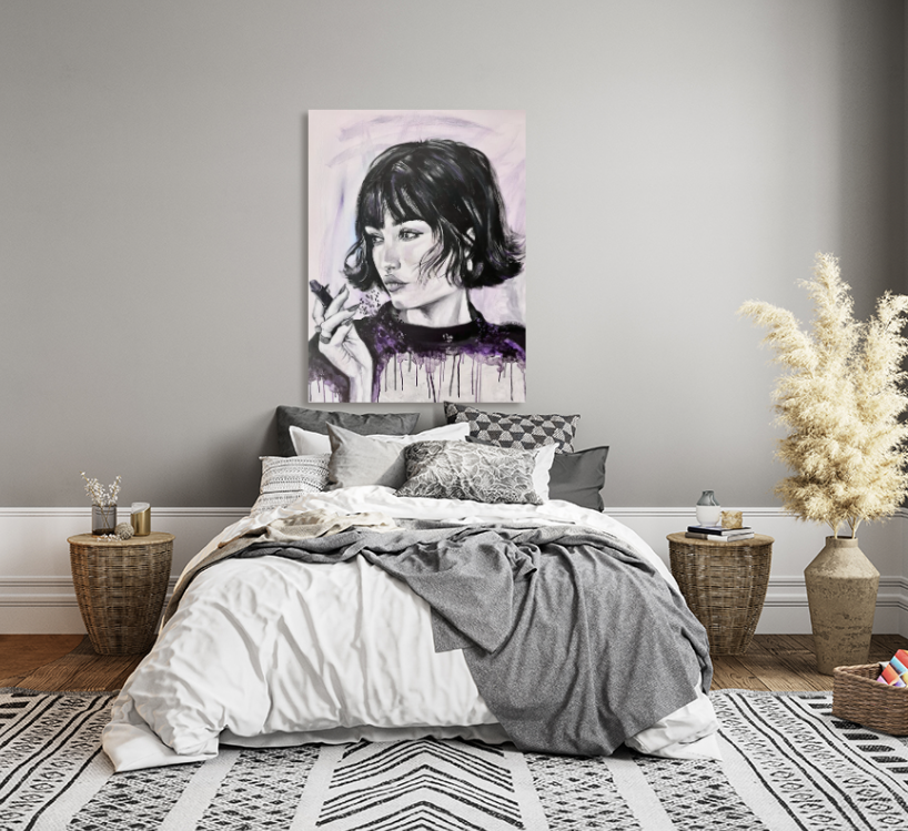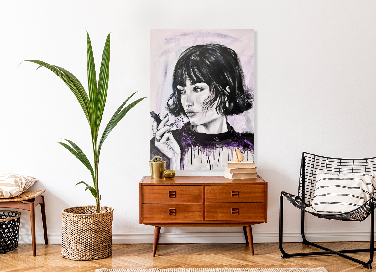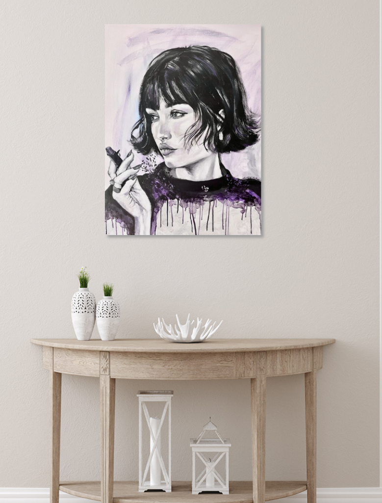 In this piece, I poured raw emotion into the subtle contrasts of black and white, with a whisper of purple to evoke mystery and depth. The poised yet contemplative gaze captures a moment of introspection, blending fine art with impressionist and minimal pop touches. This painting radiates an aura of elegance and enigmatic energy, perfect to ignite thoughtful calm in any space.