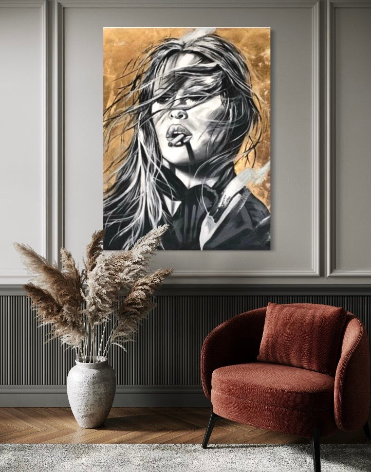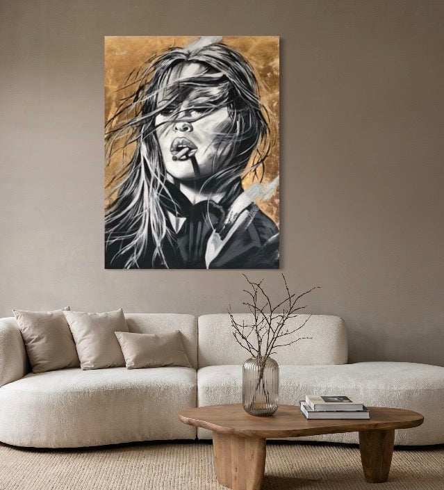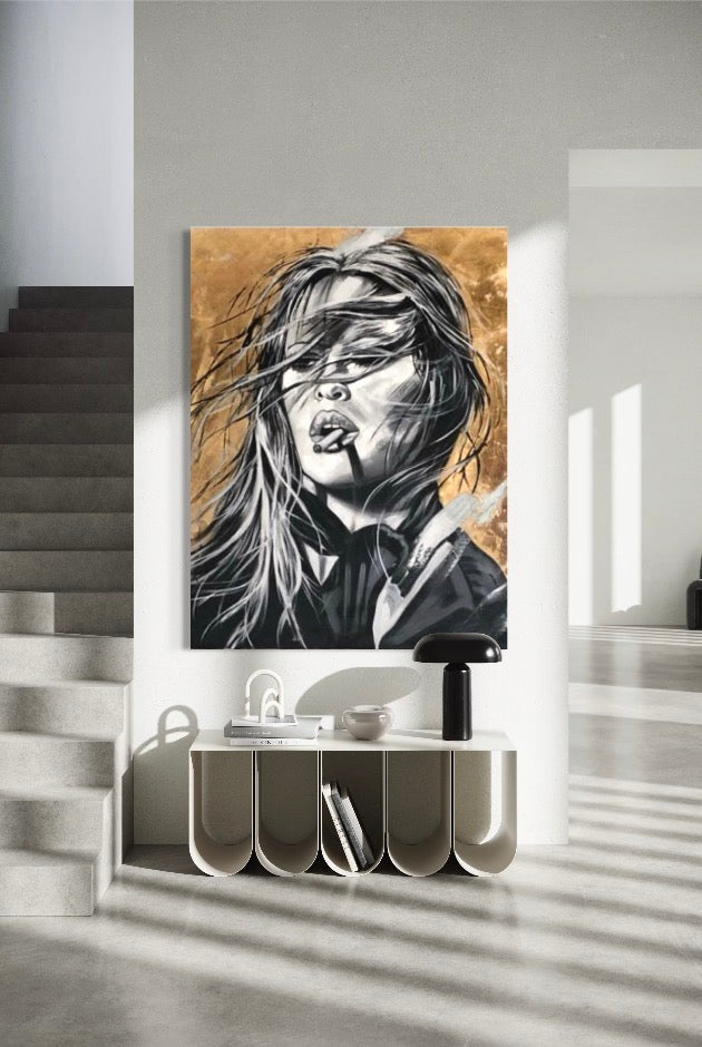 In this piece, I blend the fierceness of realism with the vibrant contrast of pop art. I applied acrylics with bold, sweeping strokes and highlighted features in gilded touches to capture a moment of raw, unbridled emotion. The wind-swept hair and the expression of intense determination speak to the spirit of overcoming adversity. This artwork is meant to evoke a sense of power and resilience, adding a dynamic energy to any space it inhabits.