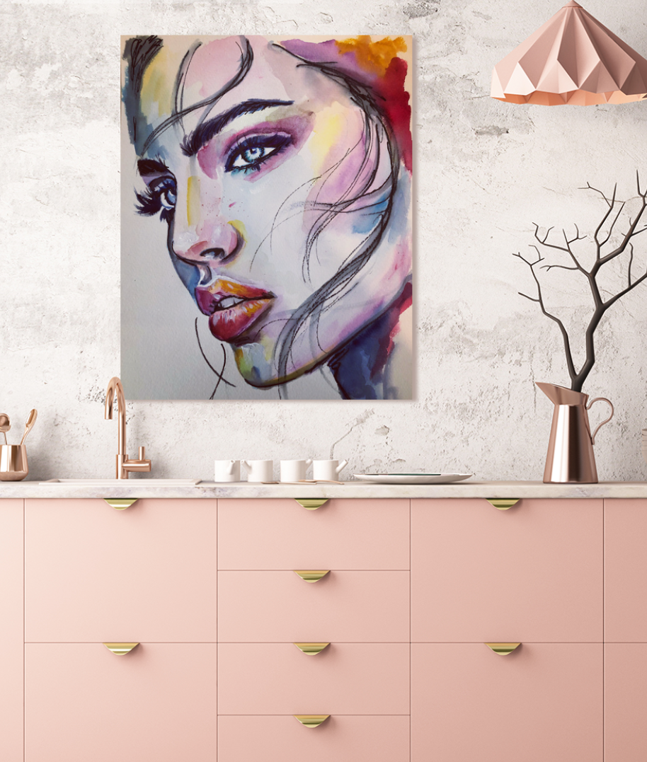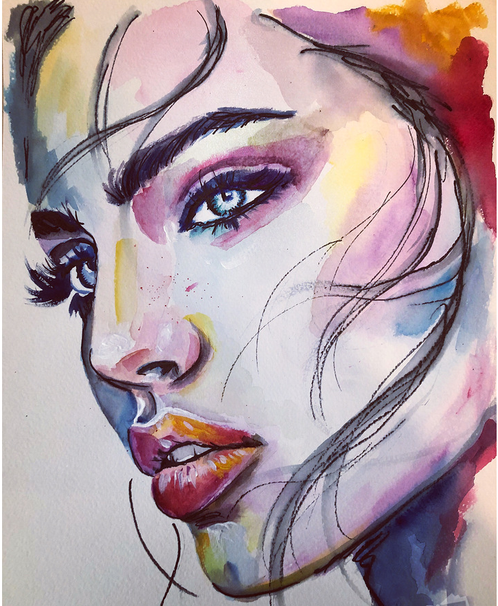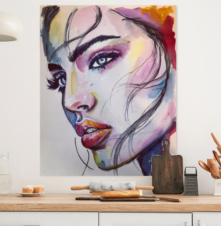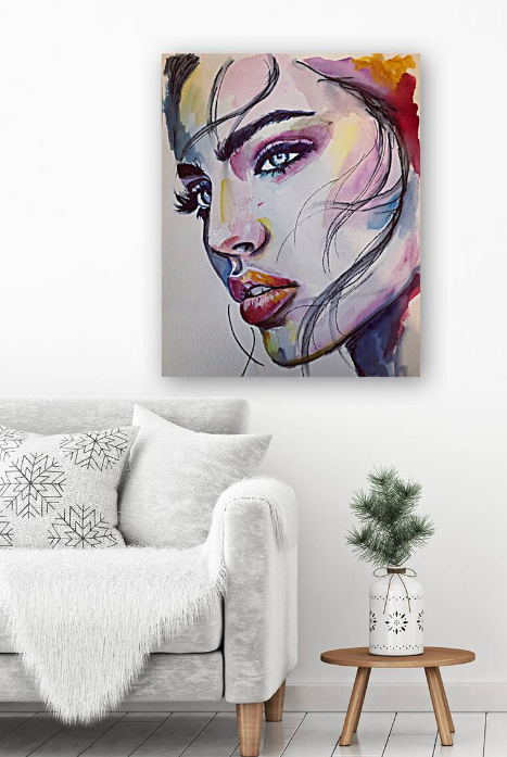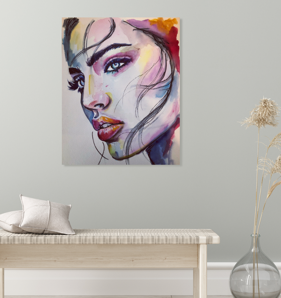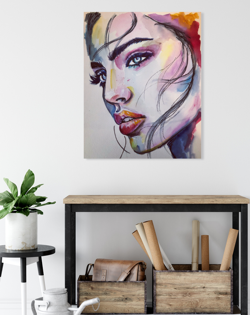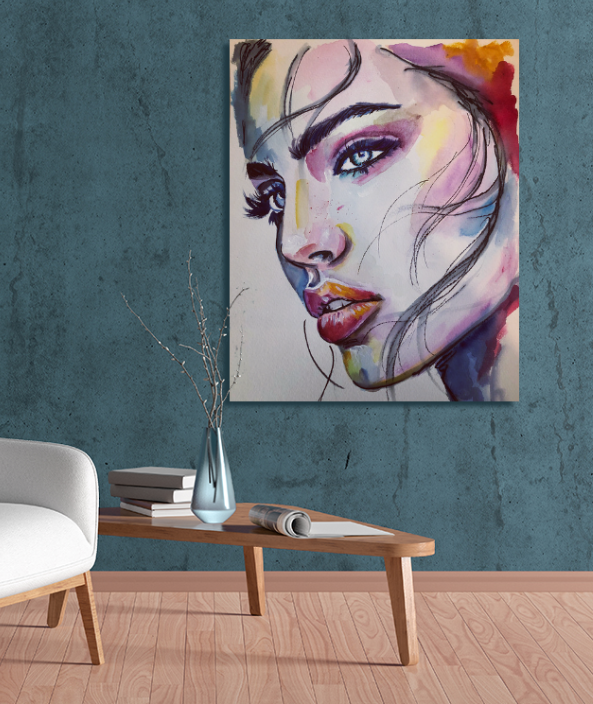 A striking watercolour portrait that draws you in with its bold colors and expressive features. Skillfully blende hues, create a dynamic interplay of light and shadows that highlights the Subject's piercing blue eyes and full lips. The fluid brushwork conveys a sense of movement, while the subtle details add depth and character.