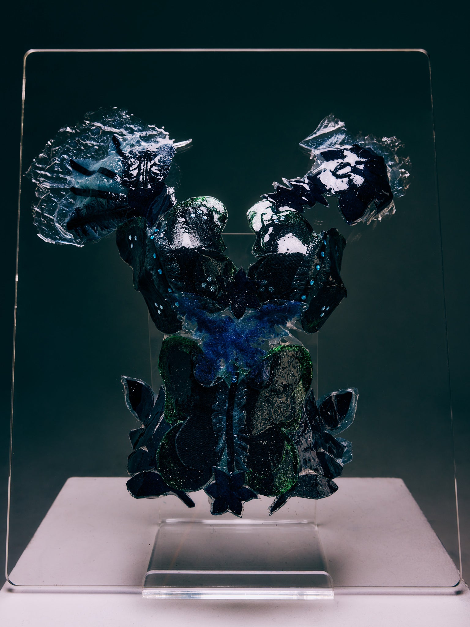 Denim Flora Echoes is a sculptural artwork that invites viewers to explore the harmonious tension between transparency and texture. Measuring 24 by 30 by 8 inches, this piece features a layered composition of resin, denim, and ink, all housed within a plexiglass frame. The use of denim, traditionally an opaque and tactile material, is transformed here by being dipped in resin, allowing it to take on a translucent quality that contrasts beautifully with the clearer resin surfaces. This deliberate interplay creates a rich visual dialogue between natural forms and industrial fabric.