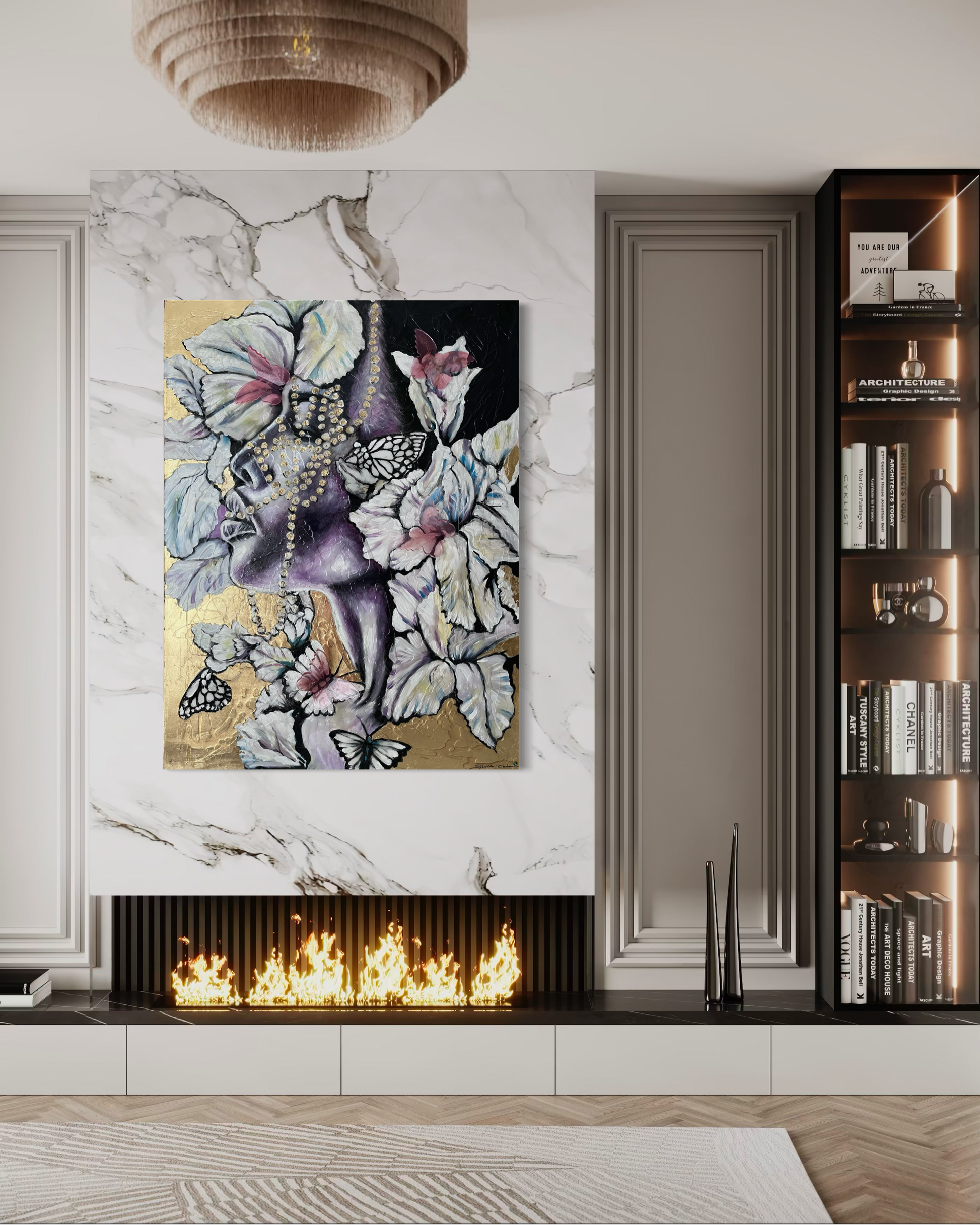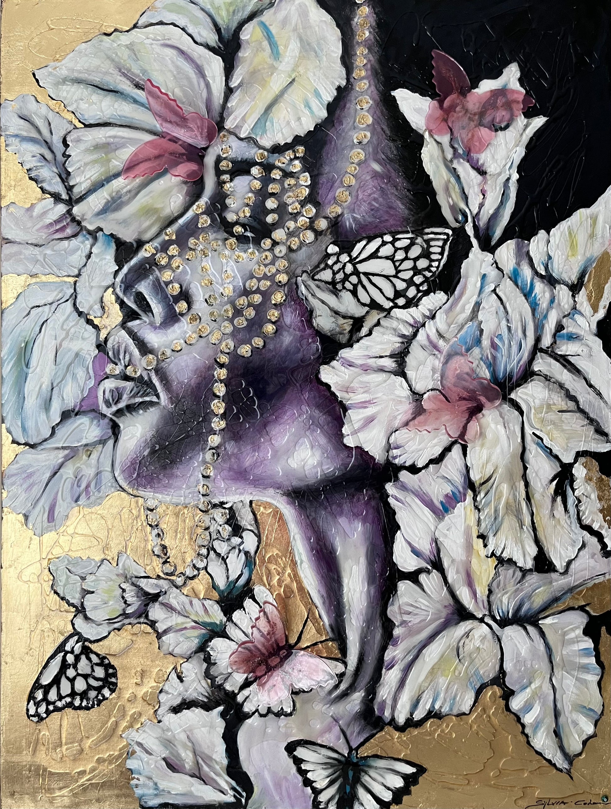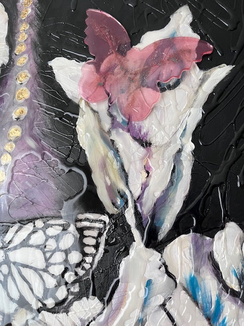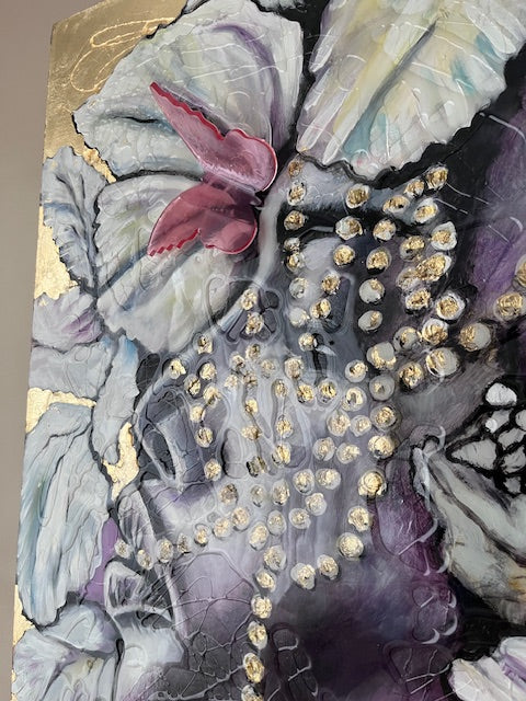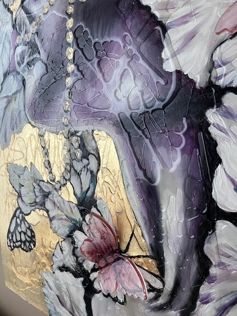 In this piece, I explore the delicate dance between nature and human emotion through expressive brushstrokes and symbolic forms. Using acrylic, resin, and gold leaf, I aimed to evoke a dreamlike atmosphere where figures and blossoms intertwine with butterflies, symbolizing transformation and fragility. This artwork brings a rich, poetic energy to your space, inviting reflection and a serene connection to beauty and change.
