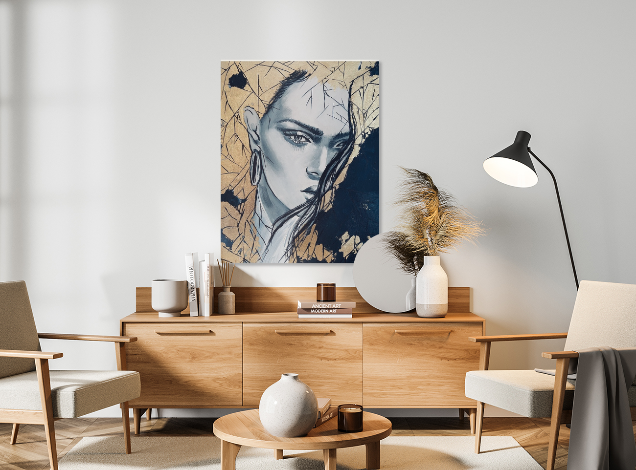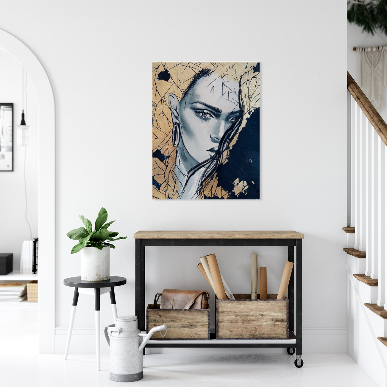 In this creation, I danced with minimalism and realism, infusing the subject with a vivacity that transcends the canvas. With acrylics and the opulence of gilding, I etched emotion and depth, crafting a visual symphony. The gilded accents are scattered thoughtfully, symbolizing the fragmented yet beautiful nature of our existence. This artwork, a beacon of energy, is a testament to timeless beauty and raw human emotion, destined to invigorate any space it graces.