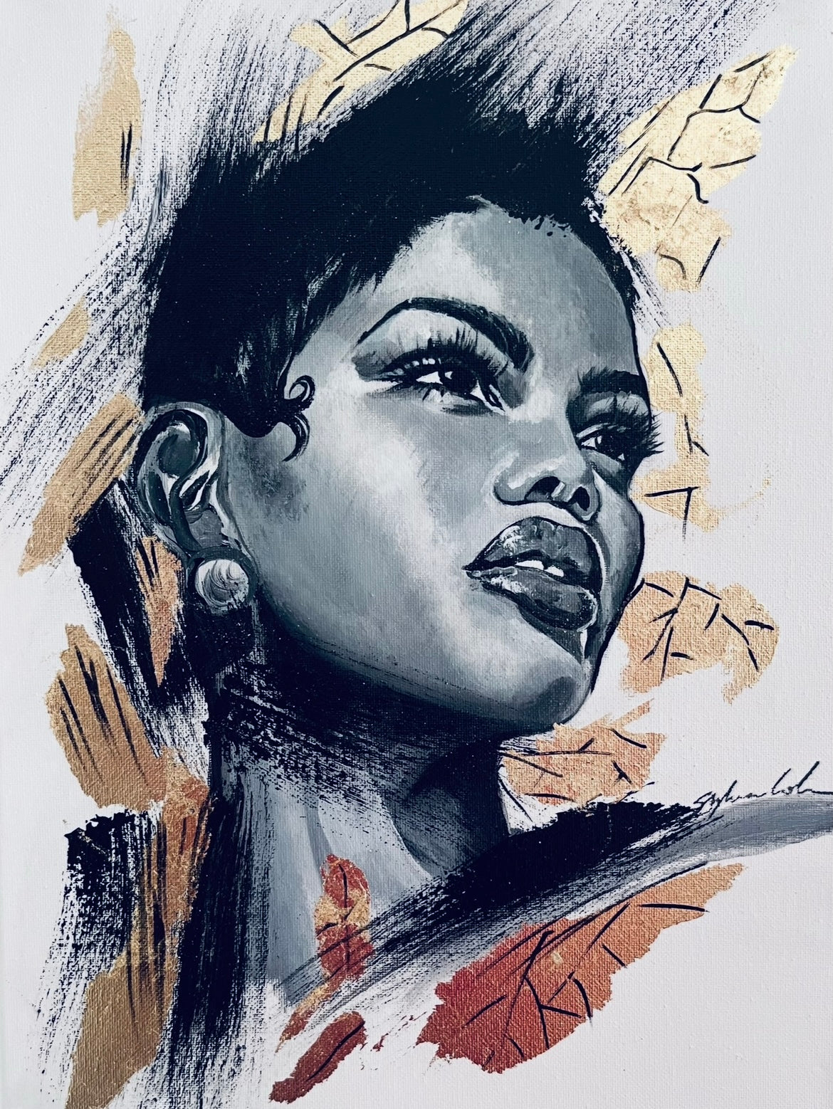 In this vibrant blend of fine art and pop realism, I've imbued acrylic with the luxury of gilding to capture a moment of fierce defiance and beauty. Every brushstroke exudes confidence, and the bold contrast between monochrome and gold leaf accents conveys a dance of light and shadow. It's an artwork that pulses with life, sure to infuse any space with dynamic energy and an air of sophistication.