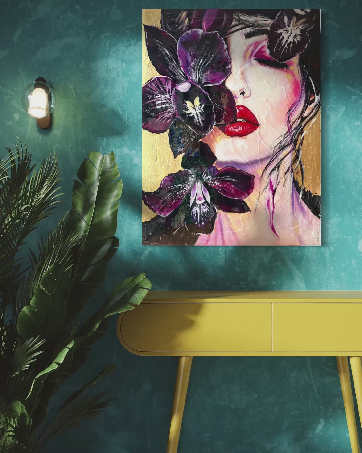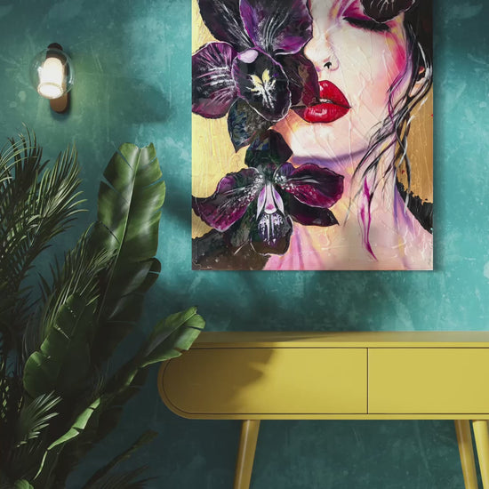 In this piece, I poured deep emotion into every brushstroke, blending vivid realism with bold expressionism. The sensual lips and serene face contrast with the mysterious, dark orchids, symbolizing beauty entwined with complexity. Golden leaf adds a touch of ethereal elegance, making it almost luminous. This artwork radiates passion and allure, promising to bring a captivating and luxurious energy into any space it inhabits.