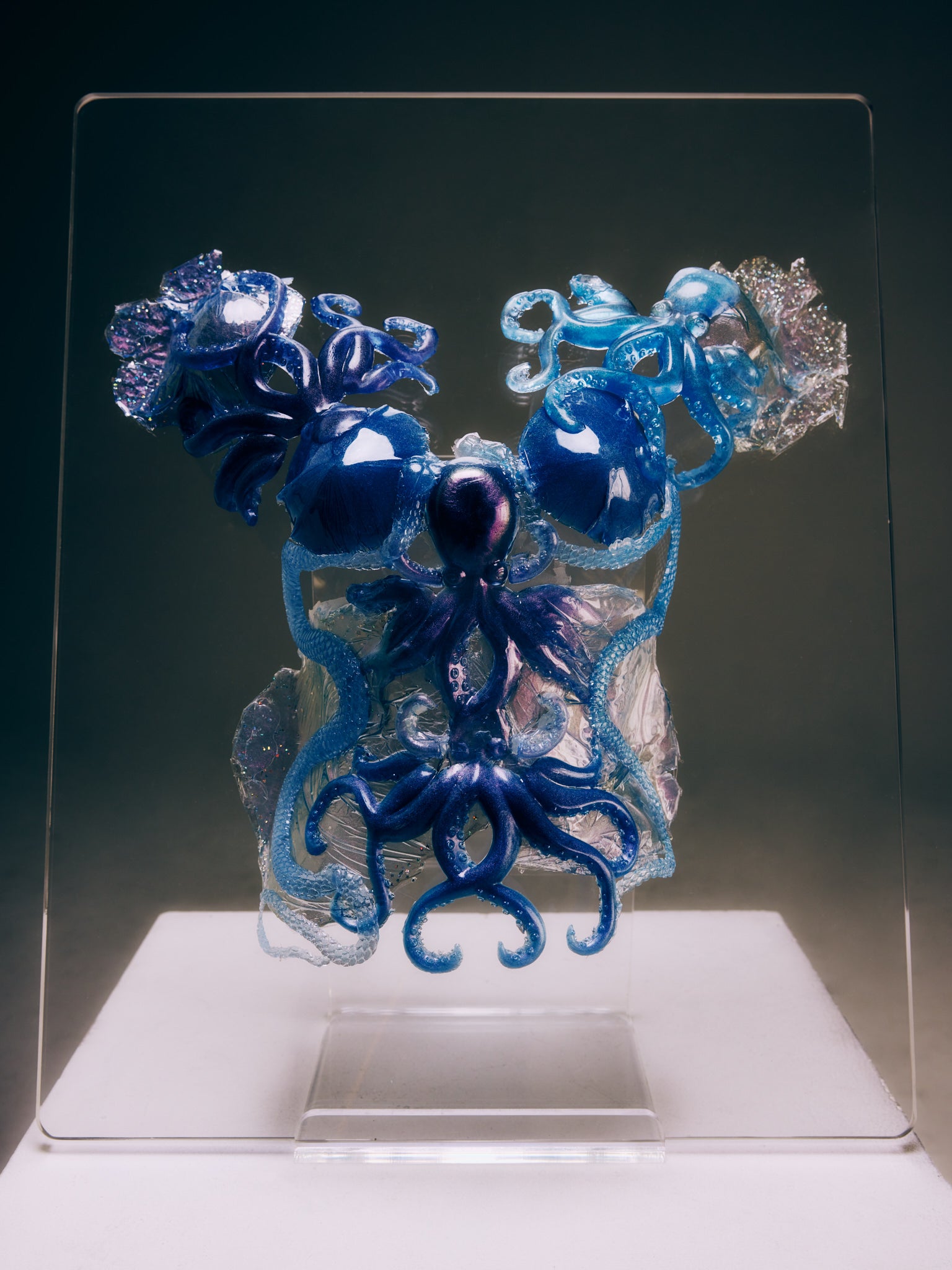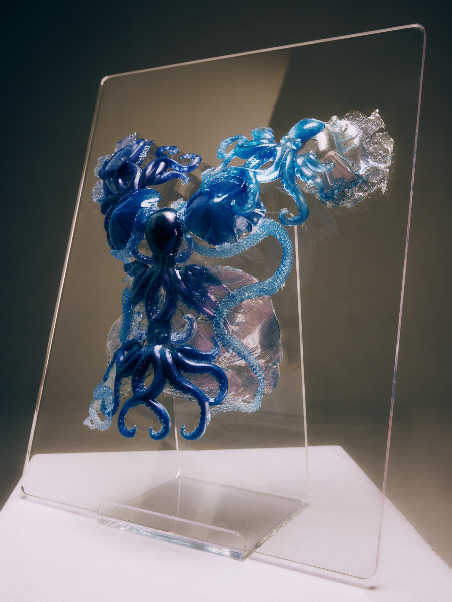 Crafted from resin and mounted on a plexiglass stand, the piece blends sculptural techniques and layered textures to bring the ocean’s mysteries into vivid focus. The work explores the connection between feminine anatomy and marine creatures, merging these elements in a harmonious palette of bright blues that emphasize both life and fluidity. This thoughtful fusion creates a dynamic visual narrative, inviting viewers to reflect on nature’s beauty and adaptability.