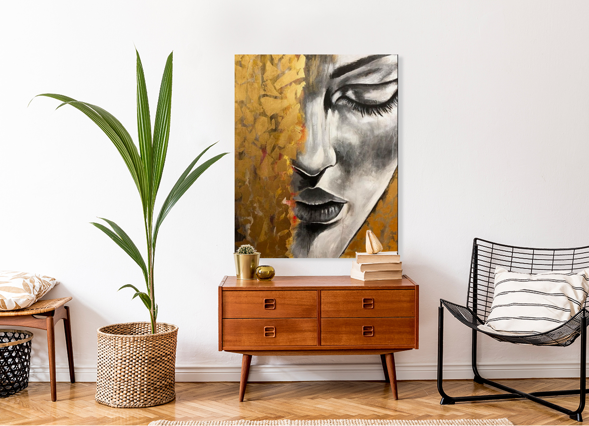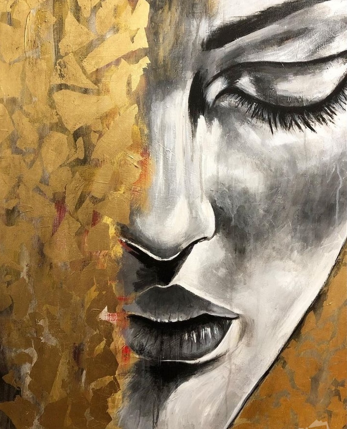 In this piece, I've melded the intensity of black and white with the allure of gold leaf to capture the profound depths of human emotion. The contrasting vibrancy and subtlety invite viewers into a personal moment of reflection. Expressing serenity and complexity, it’s a visual representation of the private layers we all carry. This painting will add a touch of reflective elegance to any space it inhabits.