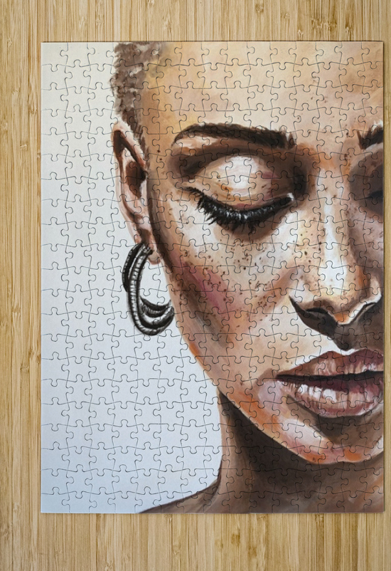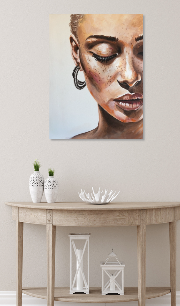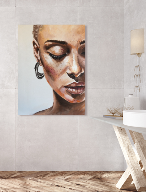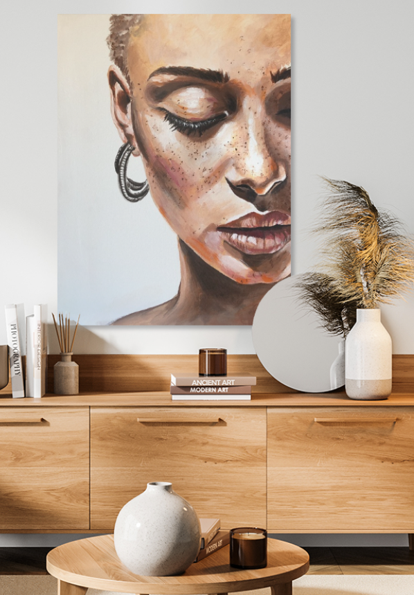 A close-up portrait of a woman painted with a warm and earthy palette. The texture of her skin with visible freckles is emphasized with subtle shading that contours the face with depth and softness. She wears large silver hoops that add a strong contrast against her warm skin, and adds a touch of elegance. The background is plain, directing the full attention to the serene expression of the woman's face.