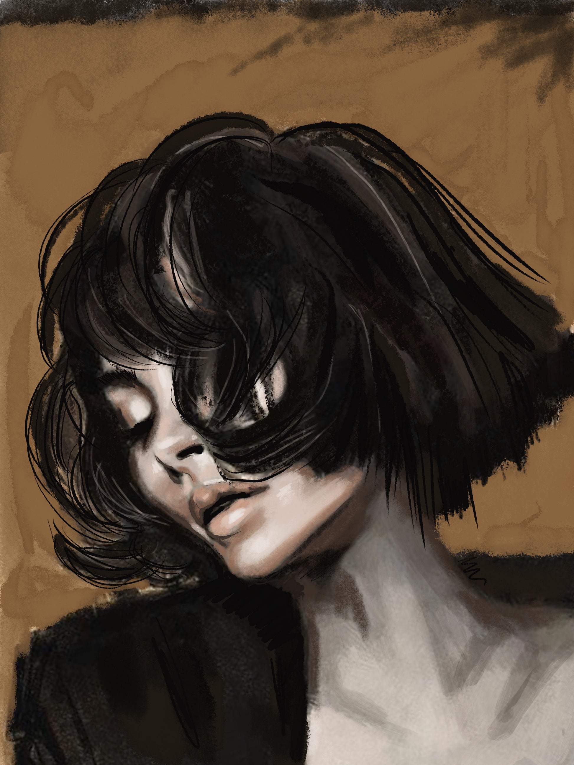 This striking piece presents a moment of introspection, where the subject's delicate features are enveloped in a cascade of dark, flowing hair. The subtle interplay of light and shadow reveals an emotional depth, inviting viewers to ponder the thoughts hidden behind those closed eyes. The warm, earthy background enhances the figure's presence, creating a sense of intimacy and connection.
