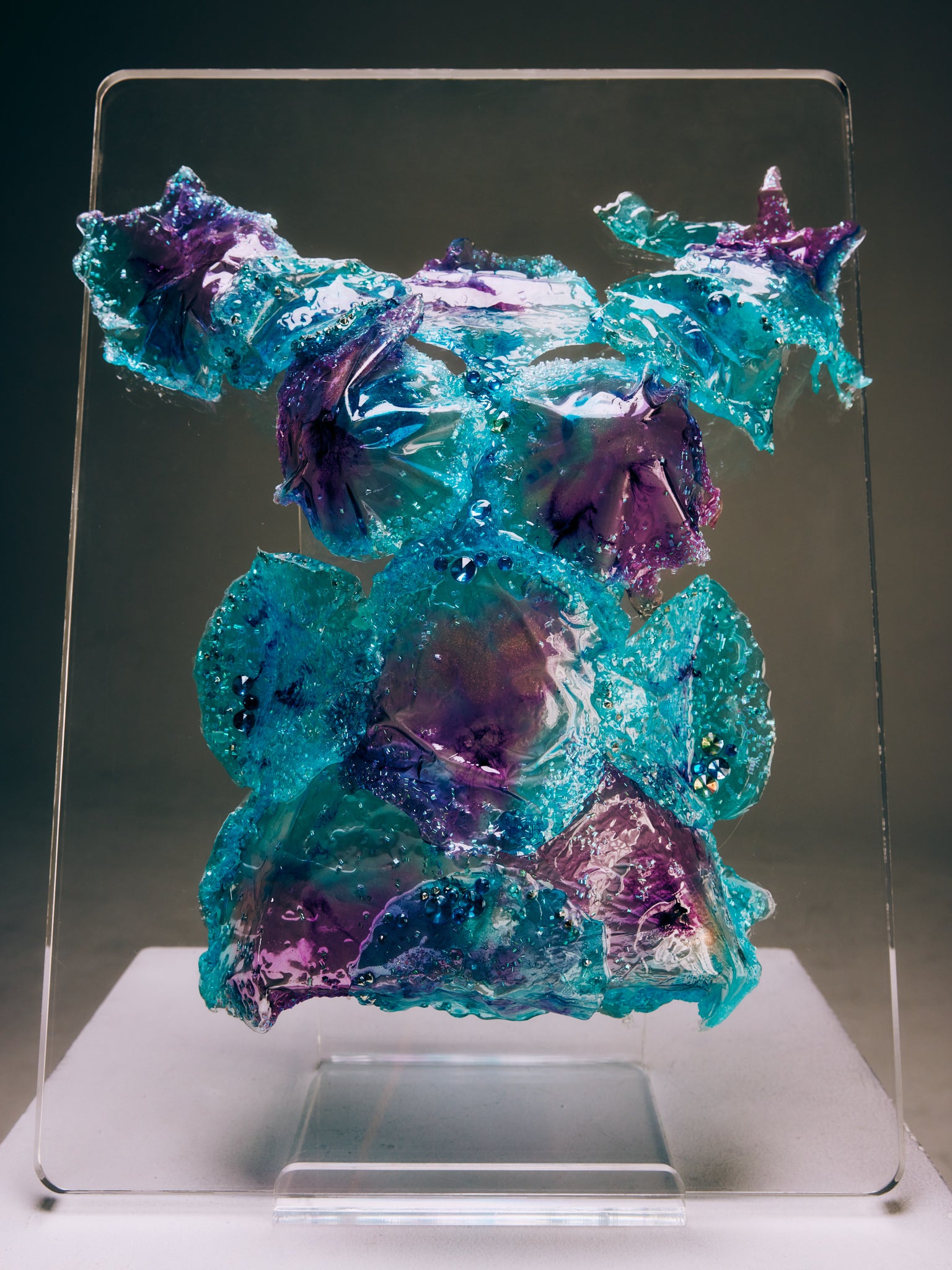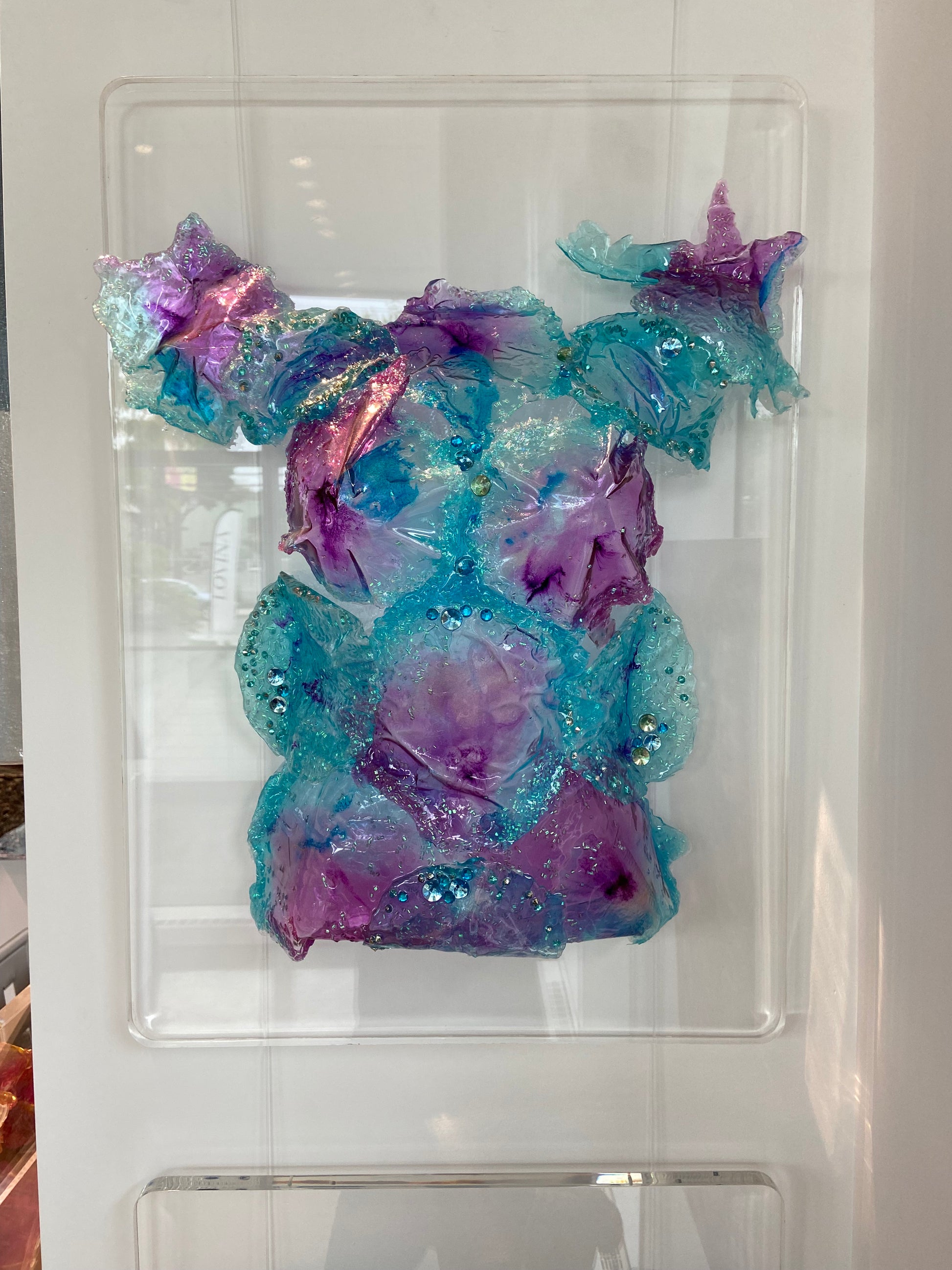 Turquoise Muse is a captivating sculptural artwork that explores the beauty and complexity of the female form through an abstract lens. Measuring 24 by 30 by 8 inches, the piece is crafted from resin and ink applied to a plexiglass frame, resulting in a translucent composition that glows with rich shades of blue and purple. Its irregular, jagged edges and layered, crumpled shapes create a textured surface that invites close examination and suggests organic motion frozen in time. Mounted on a clear rectangular stand, the sculpture is elevated and isolated, allowing light to pass through its layers and reveal subtle shifts in color and depth.